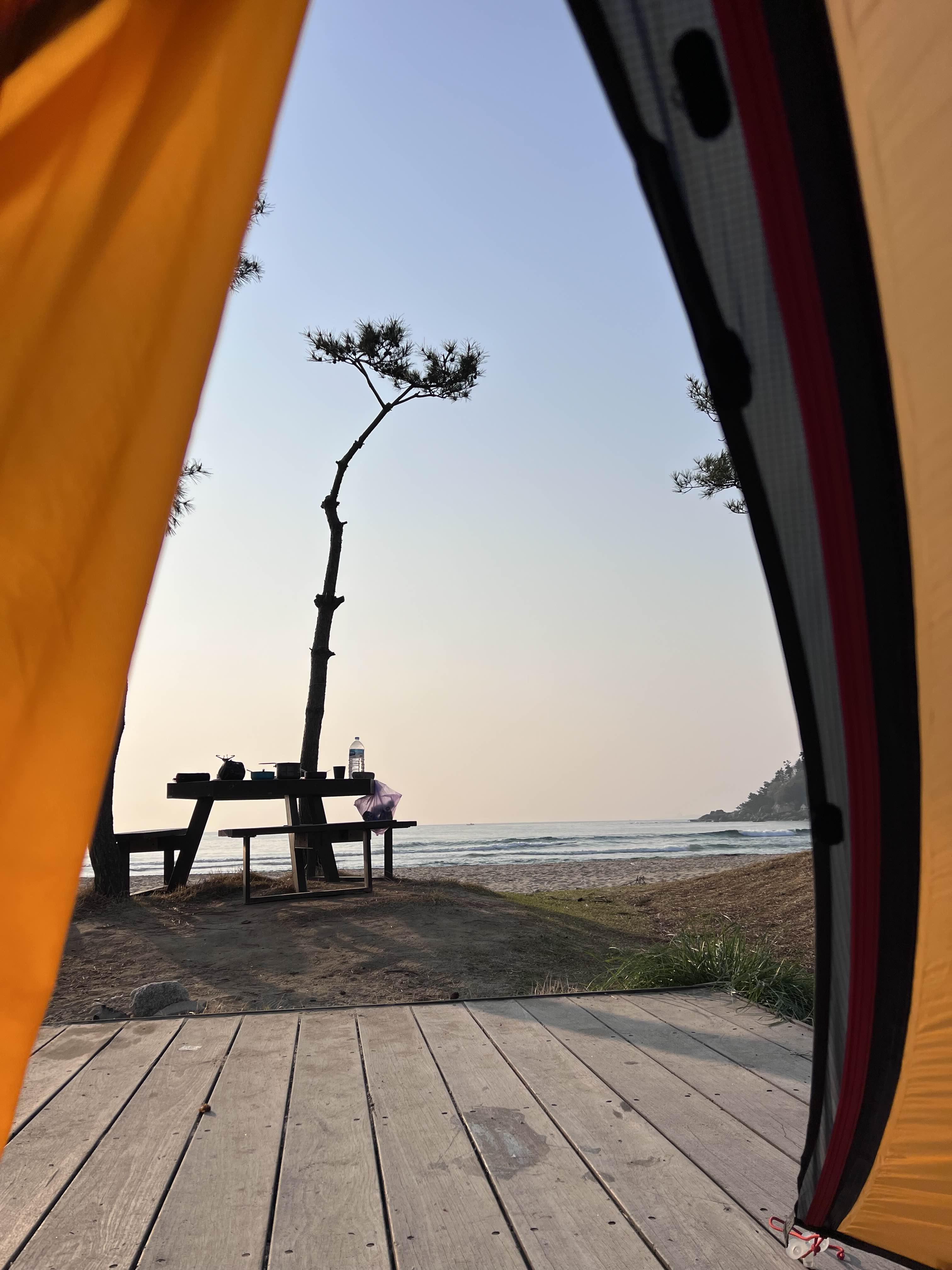 아침에 일어나서 텐트 문을 열어보면 위와 같습니다. 바로 바다가 보여서 너무 좋아요. 앞에 테이블도 있어서 어제 저녁도 먹고 아침도 먹었어요. 데크마다 다 있는 것 같지 않았어요. 저희는 3번 데크였는데 바로 앞에 테이블이 있었습니다. 일어나서 커피 한잔 하면서 윤슬을 바라보며 멍 때렸습니다.