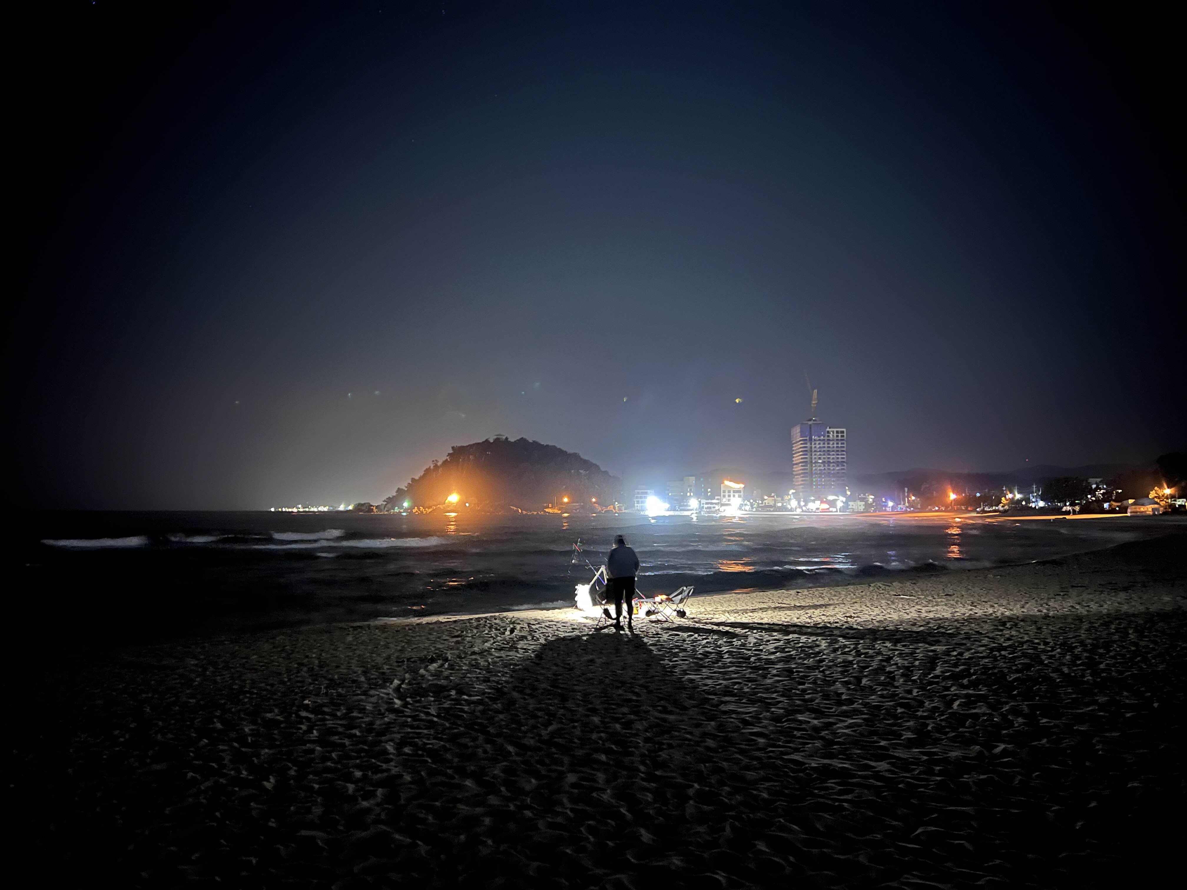 그러고 나서 아쉬운 마음을 다시 밤낚시로 달래 보기로 했습니다. 이번에는 해변가에서 던져봤습니다. 하지만 밤에도 입질은 없었습니다. 물고기들이 다 어디 간 건지.... 먼바다로 나갔나?